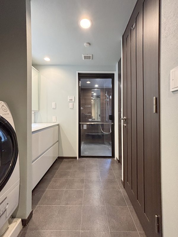 【洗面所】洗濯機置き場、洗面台、ウォークスルー収納のある洗面脱衣室です。