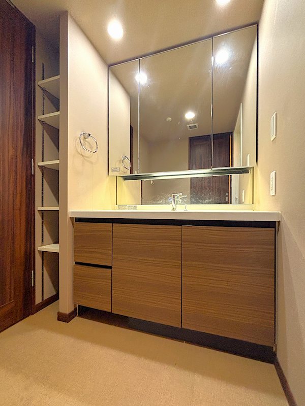 脱衣場の洗面台は内装とリンクしたモダンなデザインです。
