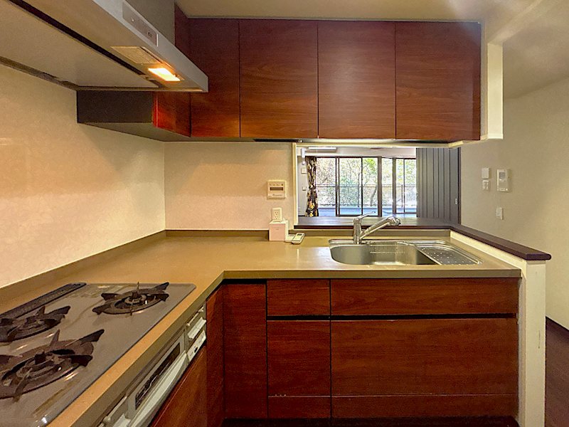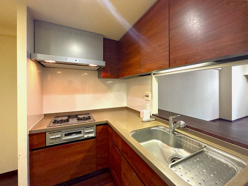 キッチンはコーナータイプで三口コンロが備わっております。