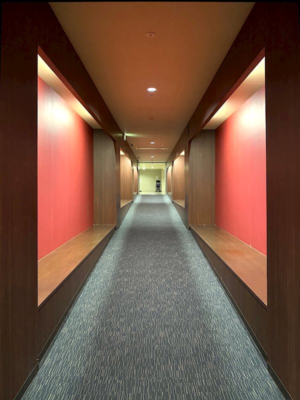 大浴場までの廊下はウッドを基調に紅色のアクセントがオシャレです。