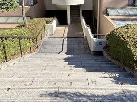 【アプローチ】前面道路から、約16段の階段を下り、約6段の階段を上ります。