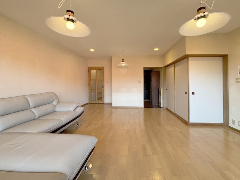 【リビング】バルコニー側から室内を撮影。配置されたソファは、お引き継ぎ可能とのことです。