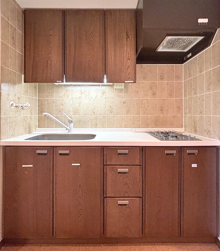 キッチンスペースです。木目調のシックなデザイン、ガスコンロは2口です。