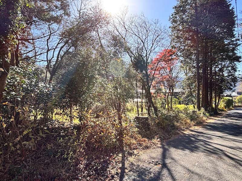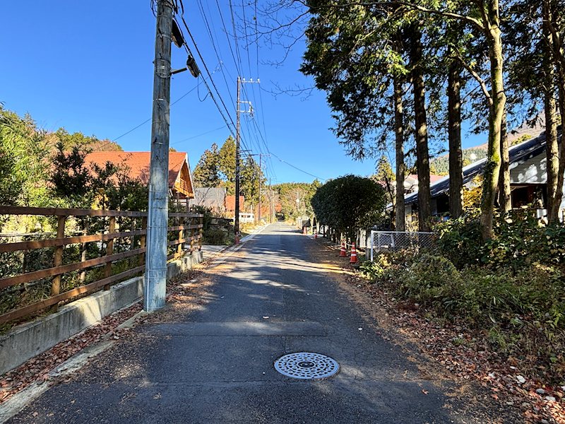 【前面道路】自然豊かな環境ですが、近くに民家、保養所、別荘も建っており、安心の立地です。