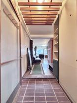 玄関を内側から撮影。天井の木製ルーバーと赤茶色のタイルがレトロモダン。