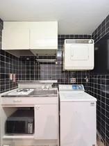 黒いタイルが印象的なレトロキッチン。現況利用はもちろん、リノベで自分好みに変えるのもお勧めです。
