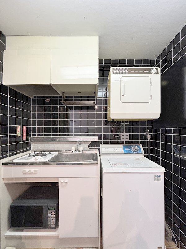 黒いタイルが印象的なレトロキッチン。現況利用はもちろん、リノベで自分好みに変えるのもお勧めです。