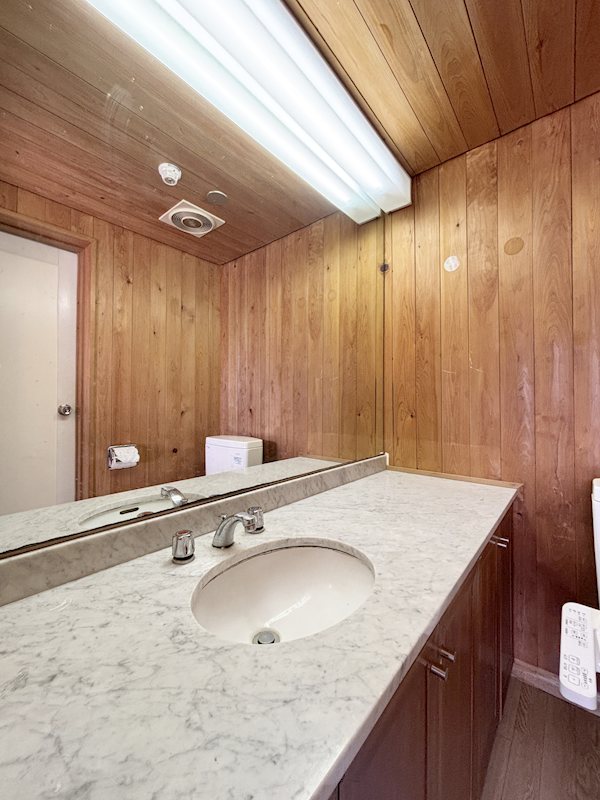 木の壁と白いルーバー扉がクラシックな雰囲気。家具が映える、趣ある空間です。