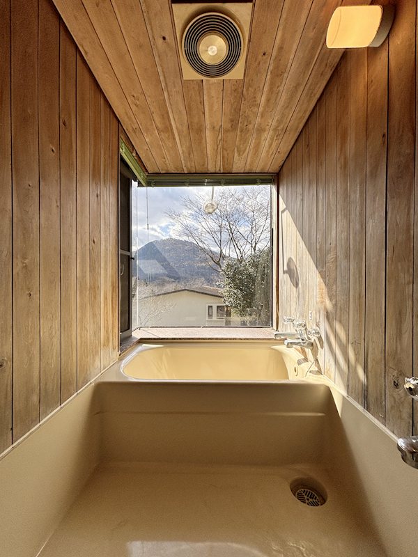 大きな窓がある明るいバスルーム。換気がしやすく、外の緑を眺めながら入浴できます。