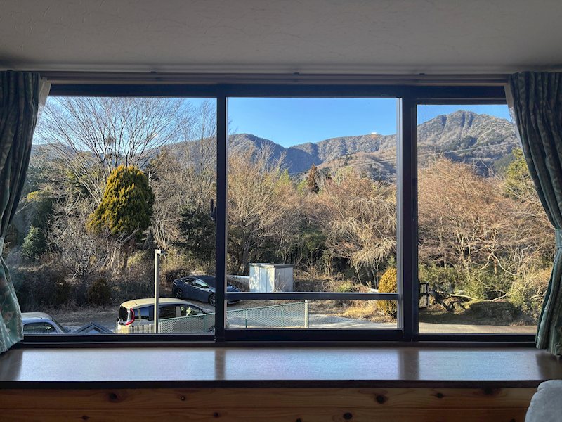 出窓を額縁に見立てたような山景が広がります。金時山の雄大な眺望をお楽しみください。