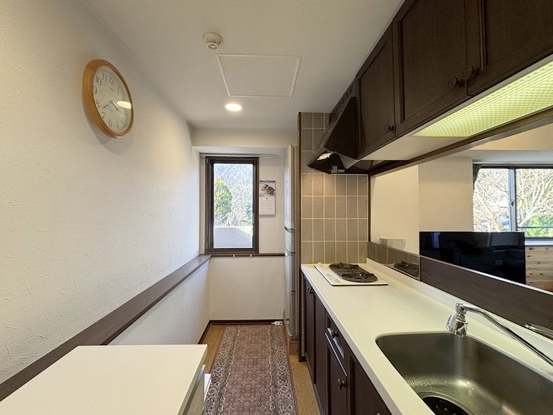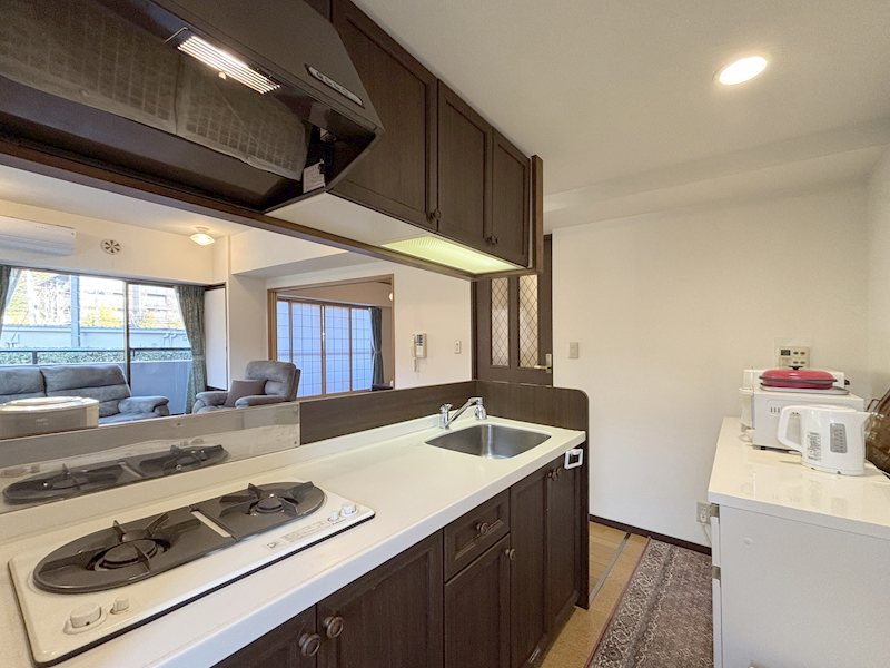 コンパクトながら使い勝手の良い二口コンロ付きキッチン。換気窓があり、匂いがこもりにくい設計です。