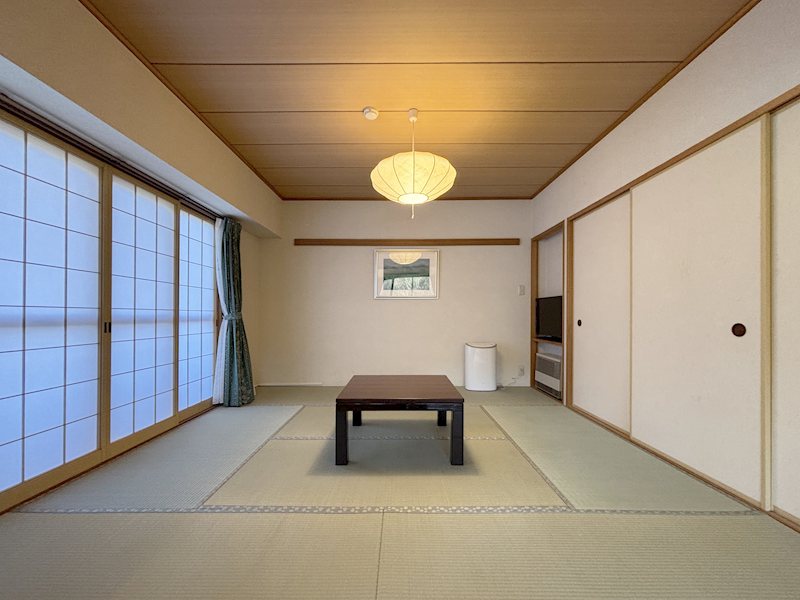 布団を並べてゆったり休める約8帖の和室。畳は令和7年12月に表替えされており、い草が香ります。