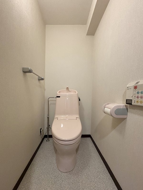 柔らかなピンク色で統一されたトイレ。交換のご相談も承ります。