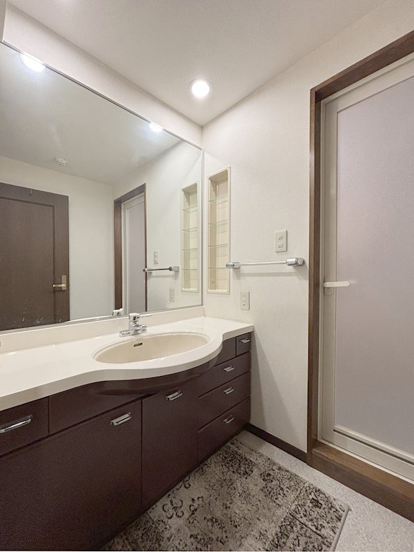 大きな一枚鏡が特徴の洗面化粧台。分譲時の仕様ですが、十分にお使いいただけます。