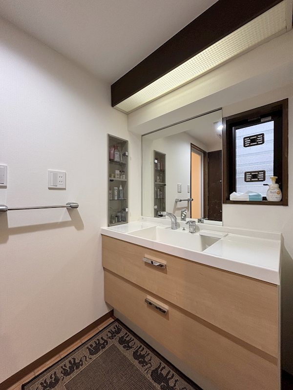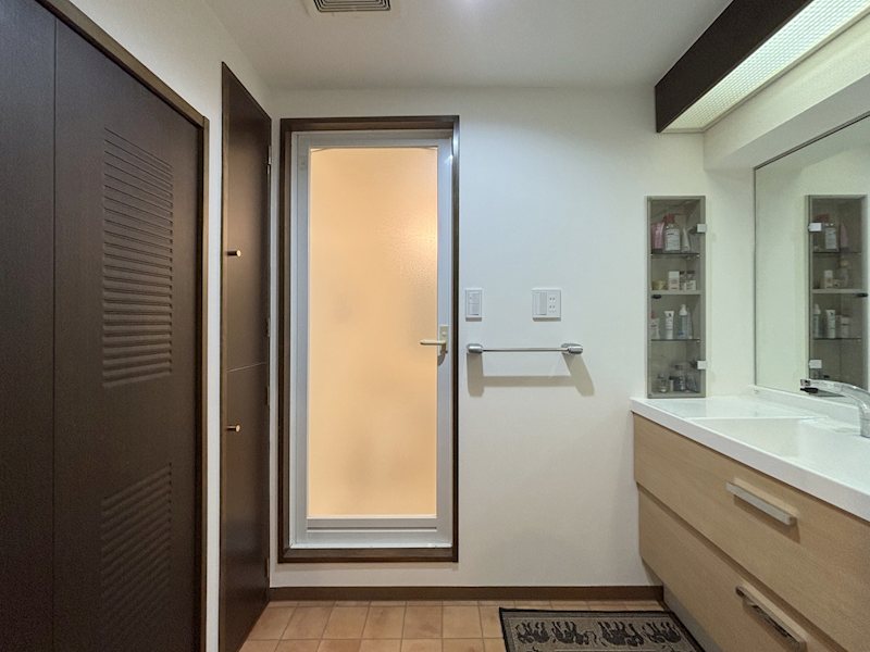 こちらは洗面脱衣室です。左側の扉の先に洗濯機置場がございます。