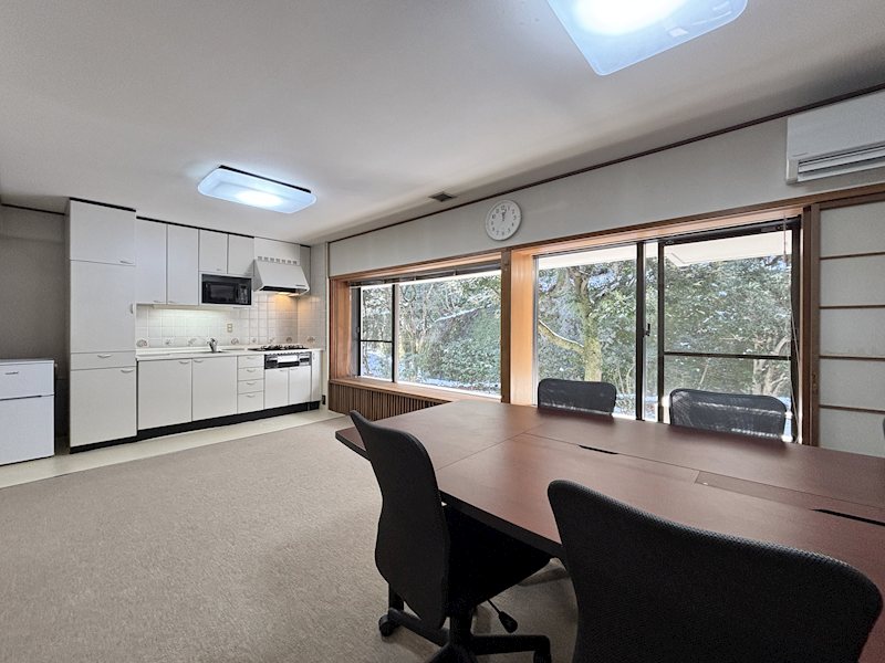 キッチン側からリビングを撮影。現在は会議テーブルセットが配置されていますが、ゆとりがございます。