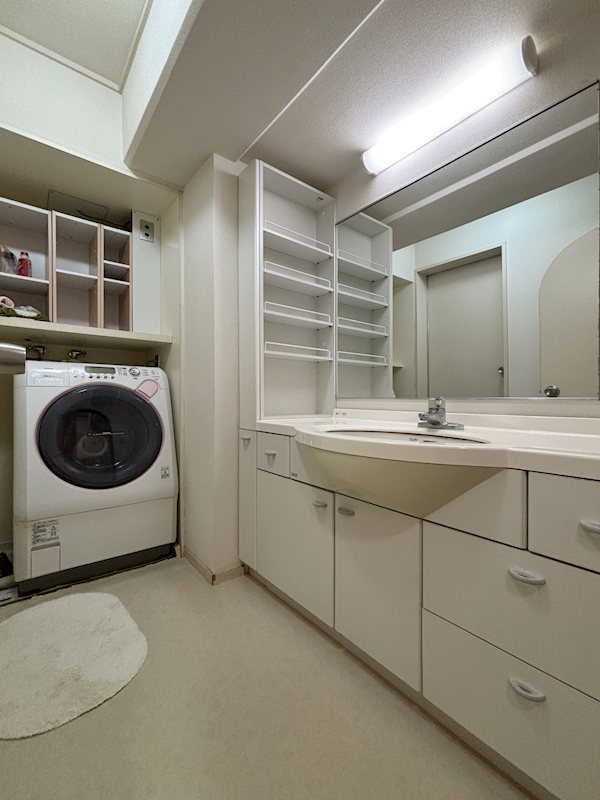 洗面脱衣室です。ドラム式洗濯機を配置するため、洗濯機パンが切断されています。