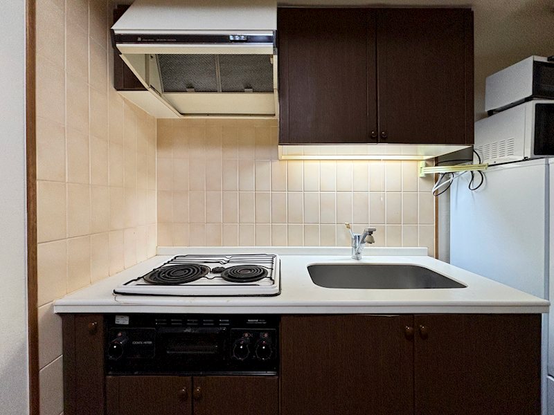 【キッチン】2口コンロ付きのキッチンで、簡単な調理も気軽に楽しめます。