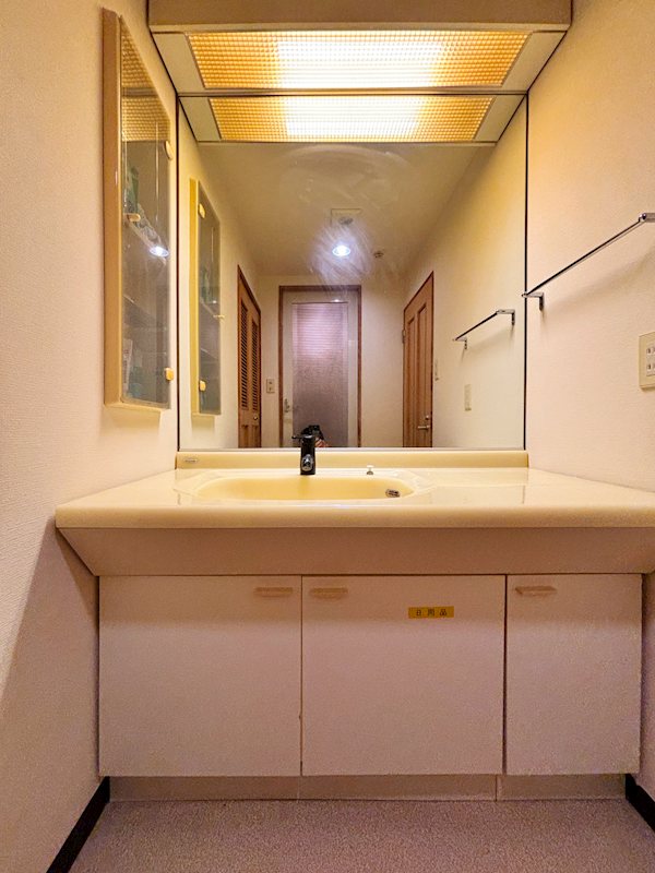 【洗面脱衣室】大きな鏡が印象的な洗面台がございます。