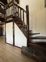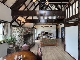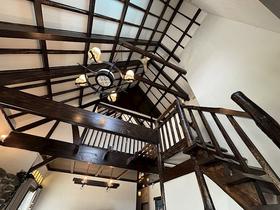 2階からは吹き抜け全体を一望。重厚な梁と石積み、そして丸窓の意匠が調和する、開放的な視界が広がります。