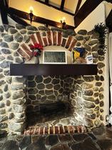 重厚な石積みのマントルピース。現在はエタノール用の暖炉が設えられ、安全に炎の揺らぎを楽しめます。