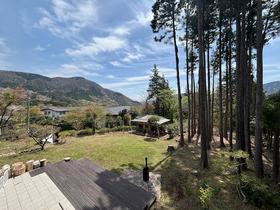 一段高い敷地から山々と空を仰ぐ、プライバシーの保たれた静謐な環境。温泉引き込みも可能な別荘地内の一軒です。