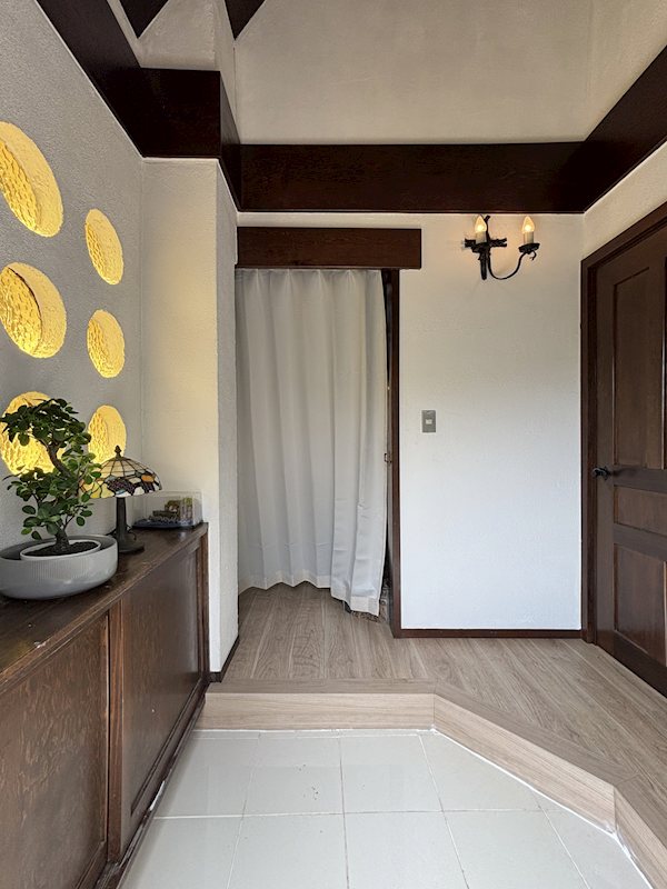 重厚な木材と柔らかな灯りが調和する、コンパクトな玄関。細かな意匠がヴィンテージな雰囲気を高めます。