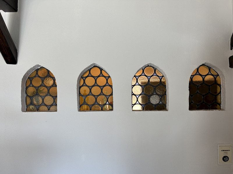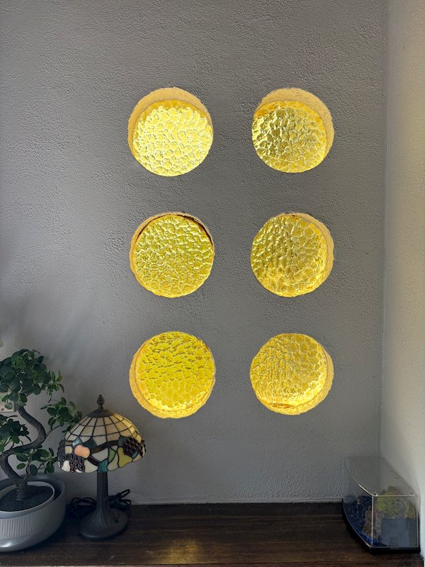 壁面に埋め込まれた6つの丸窓。凹凸のあるガラスが光を柔らかく拡散し、空間に幻想的な彩りを添えます。
