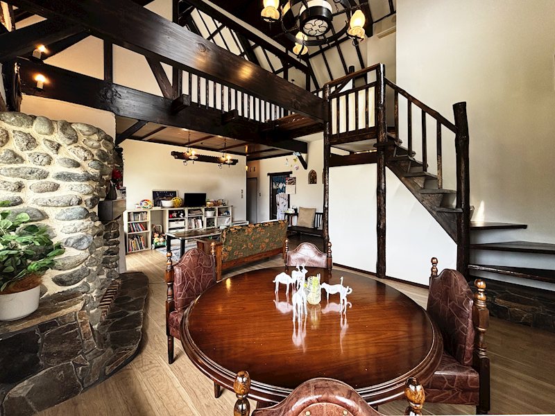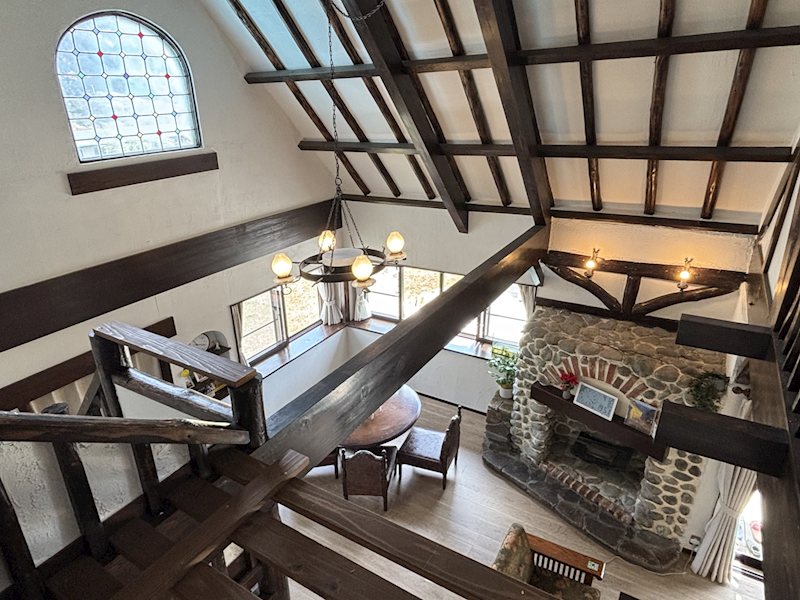 2階からは吹き抜け全体を一望。重厚な梁と石積み、そして丸窓の意匠が調和する、開放的な視界が広がります。