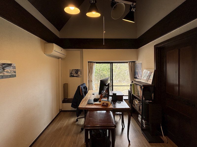 1階東側の洋室は屋根の勾配を活かした勾配天井です。現在はテレワーク用の書斎として利用されています。