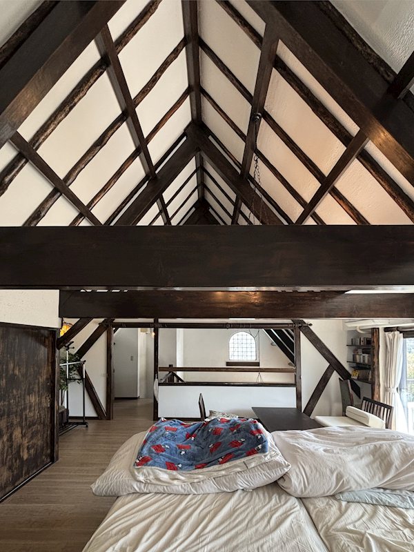頭上に広がる力強い梁の重なり。白壁にダークトーンの木材が映える、ダイナミックな造形美が印象的です。