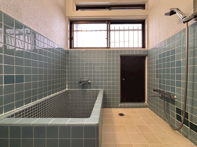 淡いブルーのタイルが空間を彩る、レトロで清潔感のある浴室。温泉の引き込みも可能です。