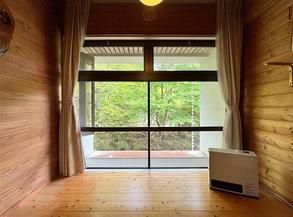 バルコニーからは管理された庭と、その向こうに芦ノ湖を望みます。