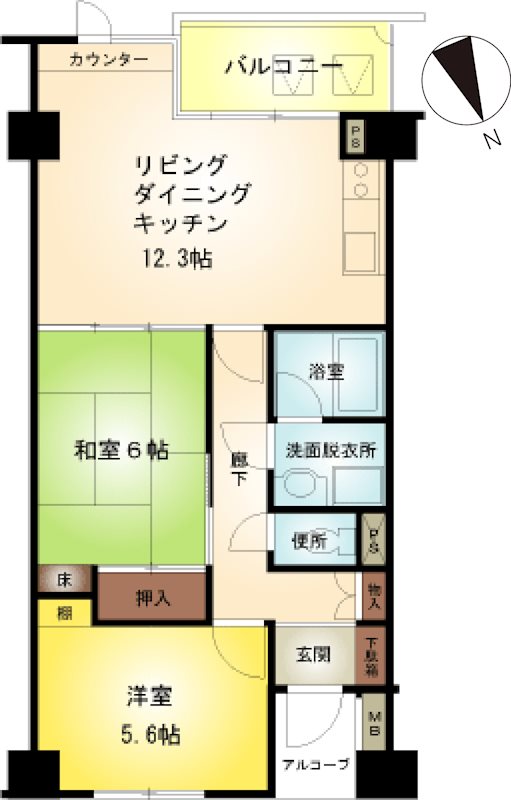 専有:56.37m² / 間取り:2LDK 昭和60年(1985年)7月 / 6階だての5階