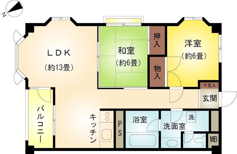 専有:91.49m² / 間取り:2LDK 平成2年(1990年)6月 / 6階だての2階