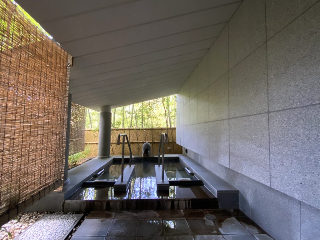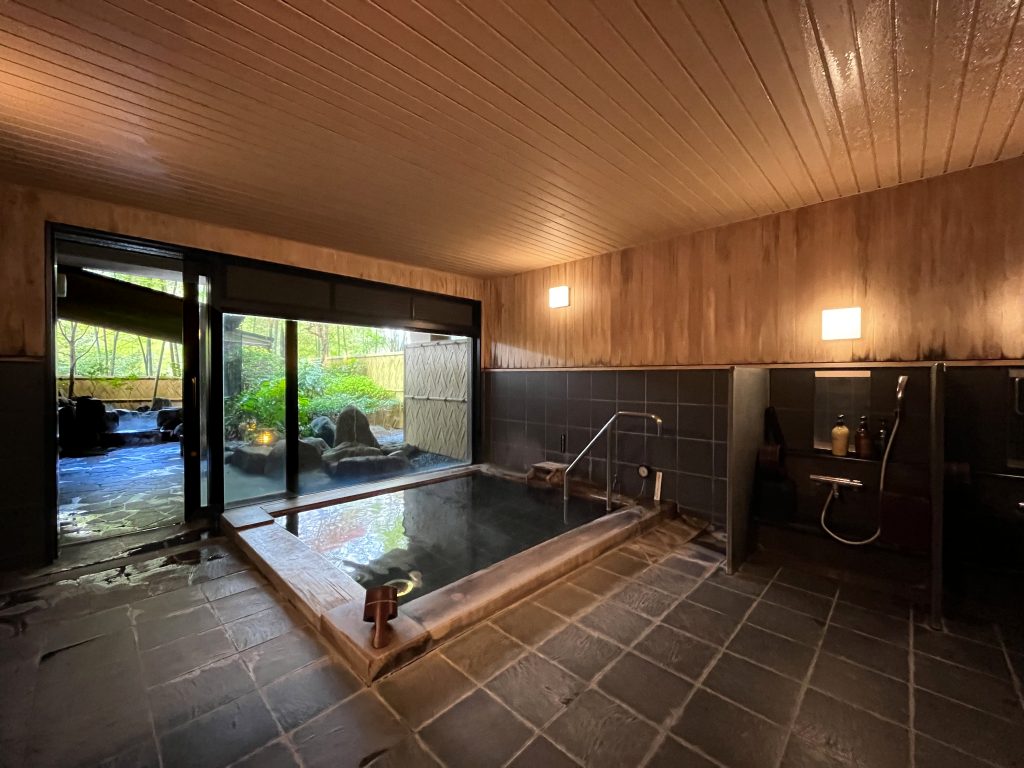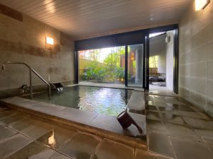 強羅駅徒歩4分。4種の天然温泉風呂(露天寝風呂、露天岩風呂、ヒノキ風呂、十和田石風呂)。本格的な薪暖炉。
