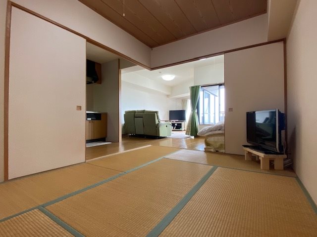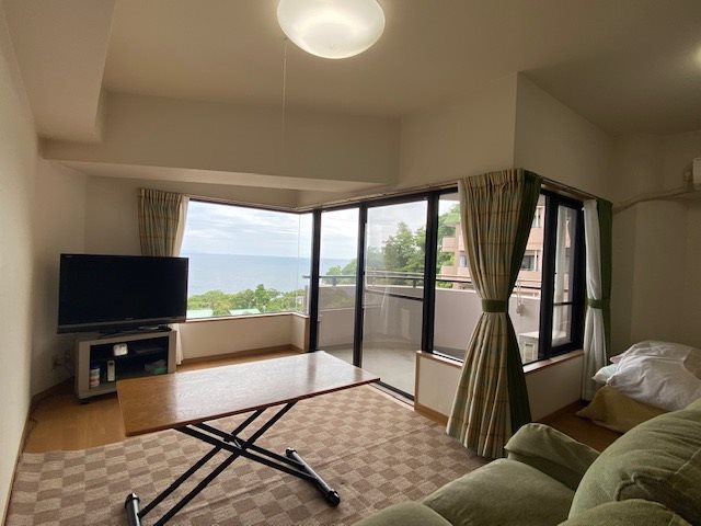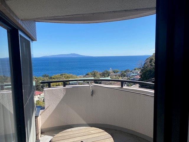 目の前に海が広がるオーシャンビュー伊豆城ヶ崎の高層階1LDKのお部屋です。室内から雄大な相模湾・伊豆大島を正面に臨みます。