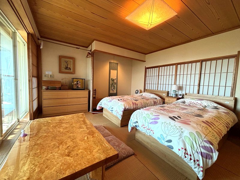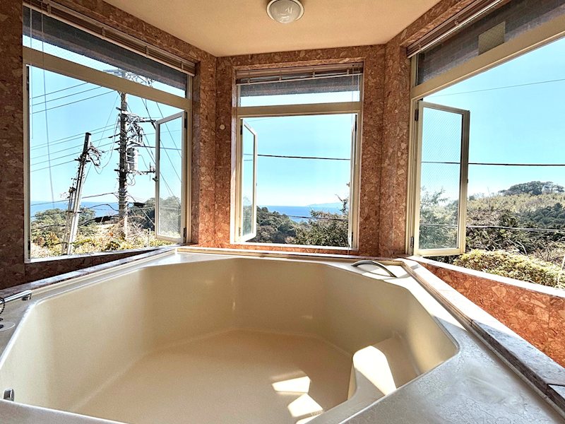 最大の魅力は眼下に川奈ゴルフ場⑮番ホールを見おろし、一面緑が広がり目の前に駿河湾と大島を一望できます。天気の良い日は三浦半島まで見ることができ、毎朝大島の左側から日の出も見れます。一年中浴室は全ての大窓を開けて海とゴルフ場と大島を眺めながら露天風呂として喜ばれています。サウナと水風呂も完備、全室南向きで風通しも良く夏涼しく、冬暖かいのでエアコンを使用する時間が少ないです。特に冬は暖炉があるので風情もありお客様に好評です。