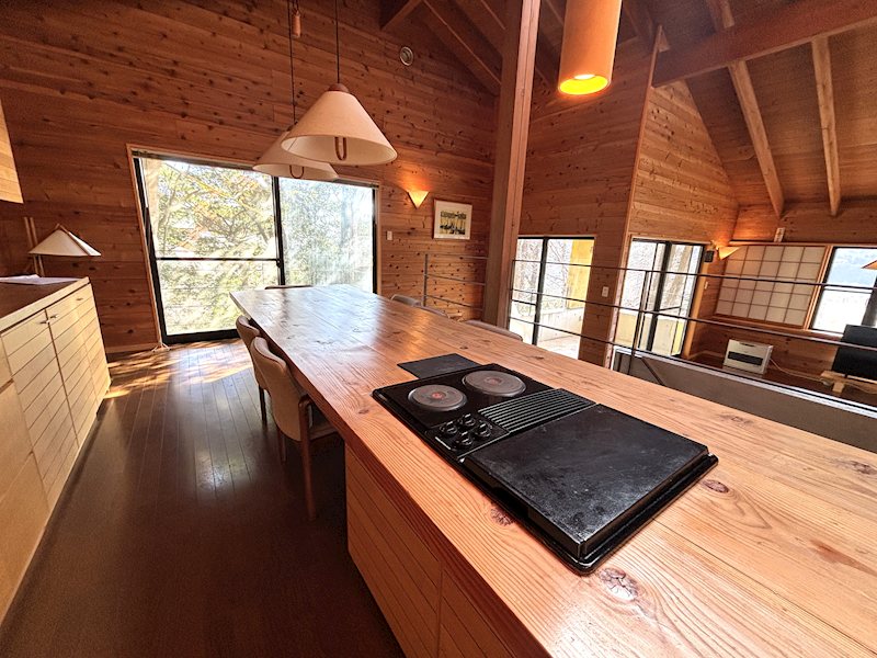 キッチンは食卓とつながったアイランド式で、室内においてバーベキューを楽しめるグリルを設けています。