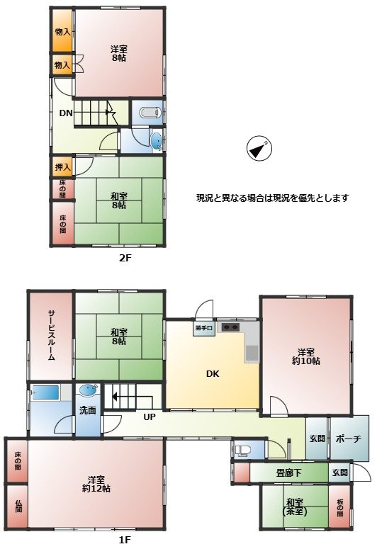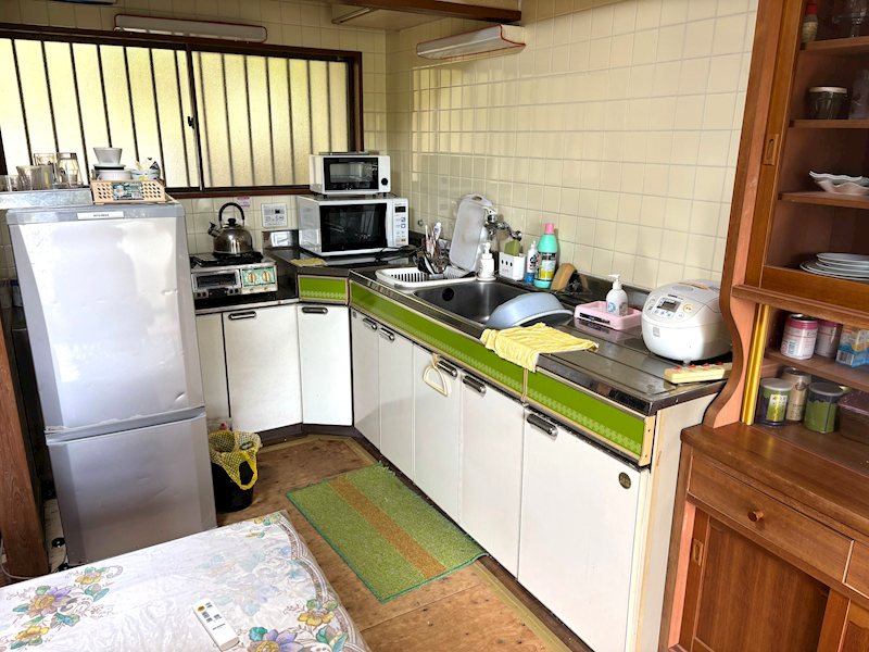 | 設備 | ガスキッチン、ガスコンロ、キッチンに窓、勝手口、給湯、クッションフロア、室内洗濯機置場、フローリング、押入、収納有、倉庫、シャワー、トイレ2ヶ所、トイレ有、バス・トイレ別、バス有、温水洗浄便座、洗面化粧台、洗面所にドア、洗面所独立、脱衣所、暖房便座、浴室に窓、洗面所に窓、南庭、南面バルコニー、家庭菜園、玄関ポーチ、玄関ホール、床の間、茶室、南面2室、南面3室、平置駐車場、舗装駐車場 | ||