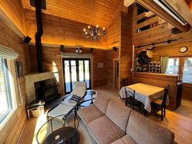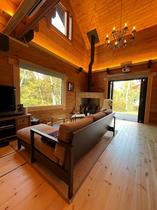 LDK全体の様子。ログハウスらしい木々のぬくもりが感じられる、別荘らしい空間です。