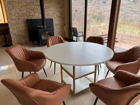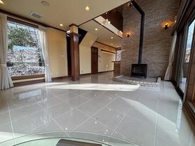 旧軽井沢ゴルフクラブの瑞々しいフェアウェイが眼下に広がり、その先には三笠から愛宕山へと続く稜線が一望!遮るもののないパノラマビュー!約665坪の敷地には、春を告げるヤマザクラ、可憐な白い花から赤い実をつけるジューンベリー、そして初夏を彩るヤマボウシ、一年中途切れることのない景観美を演出します。室内は、高級感あふれるタイル床と、空間を引き締める石積みの壁が印象的!高い天井の吹き抜けと、床から天井近くまで届く大きな窓が、外の絶景を一枚の絵画のように室内に取り込みます。