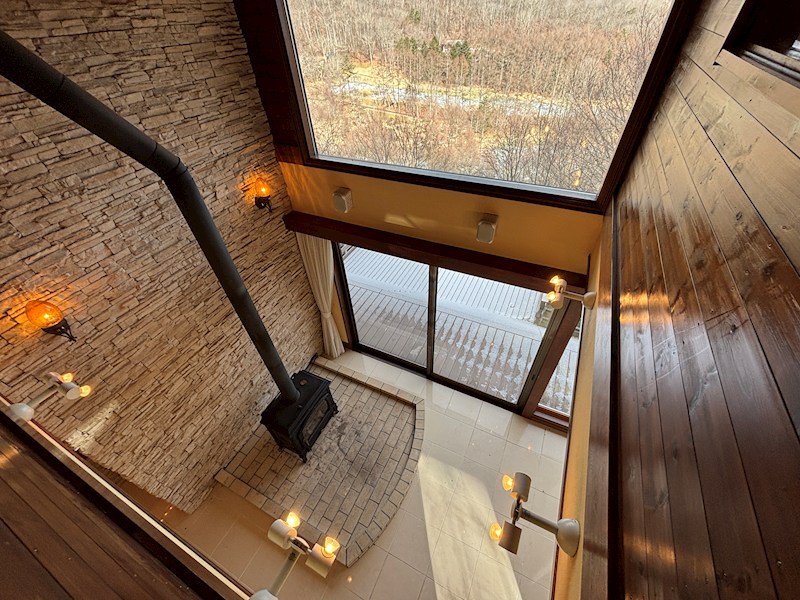 旧軽井沢ゴルフクラブの瑞々しいフェアウェイが眼下に広がり、その先には三笠から愛宕山へと続く稜線が一望!遮るもののないパノラマビュー!約665坪の敷地には、春を告げるヤマザクラ、可憐な白い花から赤い実をつけるジューンベリー、そして初夏を彩るヤマボウシ、一年中途切れることのない景観美を演出します。室内は、高級感あふれるタイル床と、空間を引き締める石積みの壁が印象的!高い天井の吹き抜けと、床から天井近くまで届く大きな窓が、外の絶景を一枚の絵画のように室内に取り込みます。