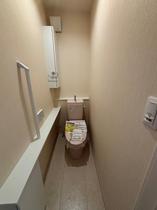 2階トイレ。壁面にスリムなカウンターを設けており、ちょっとした小物を置くのにも便利です。