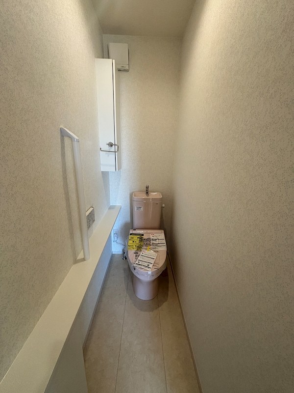 2階トイレ。壁面にスリムなカウンターを設けており、ちょっとした小物を置くのにも便利です。