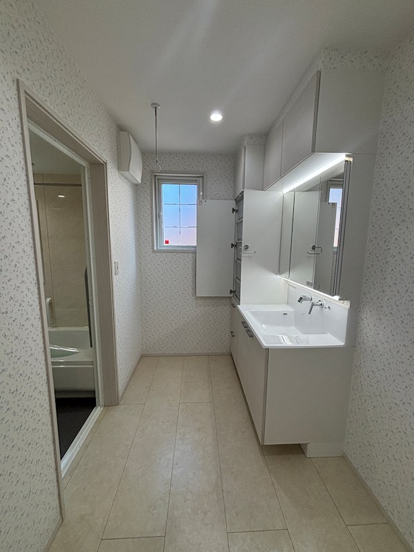 ワイドな三面鏡を備えた洗面化粧台は、収納力も抜群