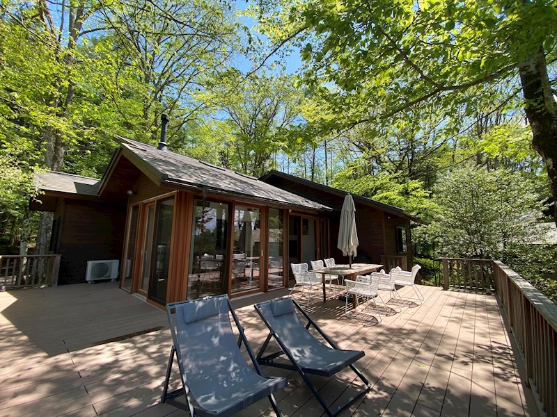 豊かな緑に包まれ、陽光が降り注ぐ、広大なデッキのある贅沢な平屋暮らし