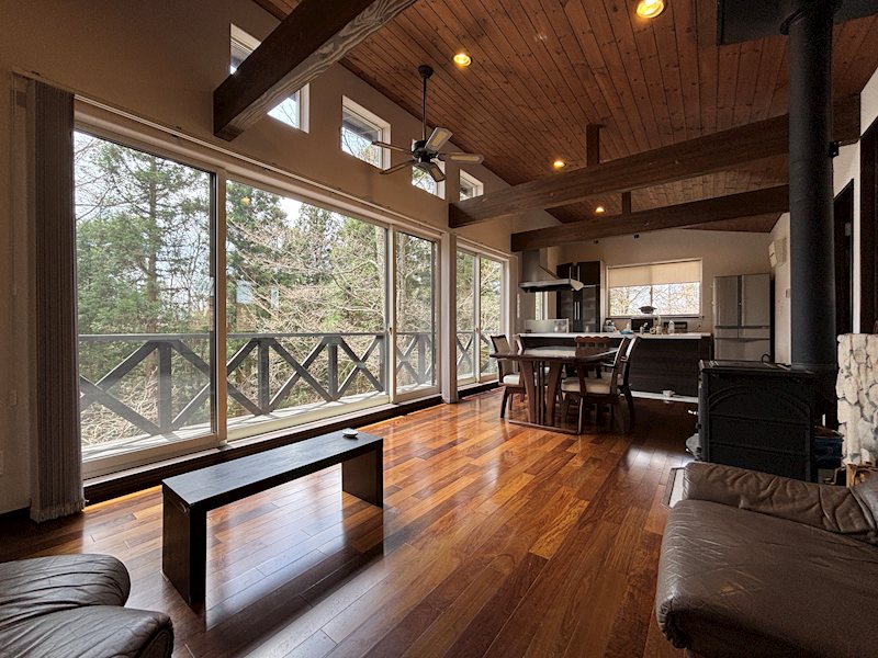 旧軽井沢の森を眺める非日常感!吹き抜けのリビング一面に広がる軽井沢の木立が見事な別荘!
