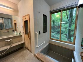旅館のようなタイル張りのバスルームは木々を臨めます