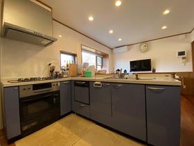 キッチンの様子。食洗機やンレンジ、収納力十分な備え付け棚がございます。